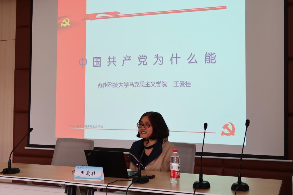 4月15日下午,yl23455永利官网在院士楼报告厅举办党史学习教育专题宣讲会。党史学习教育苏州科技大学宣讲团成员、马克思主义学院形势与政策教研部主任王爱桂老师作题为《中国共产党为什么能》的专题宣讲。宣讲会由学院党总支副书记李永丹主持,学院全体党员和入党积极分子代表参加了宣讲会。